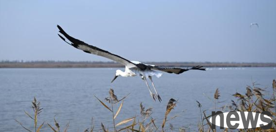 On November 23, a rescued Oriental white stork took off in the Qilihai Wetland. Photo by Xinhua News Agency reporter Zhao Zishuo