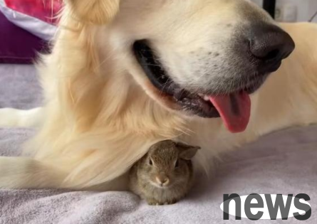 The little rabbit uses the golden retriever as a nest to sleep. The golden retriever is not angry and adjusts his body to avoid crushing the little rabbit. The golden retriever’s heartwarming behavior made the owner feel that the atmosphere at home was so loving.