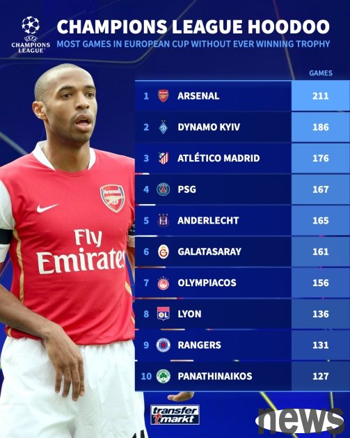 In the early morning of tomorrow, the Champions League final between Paris and Inter Milan is about to start, and Paris is determined to compete for the first Champions League trophy in team history. Among the clubs that participated in the Champions League but did not win the championship, Arsenal still failed to win the championship in 211 games, while Paris, which is about to strive for the first championship, ranked fourth with 167 games.