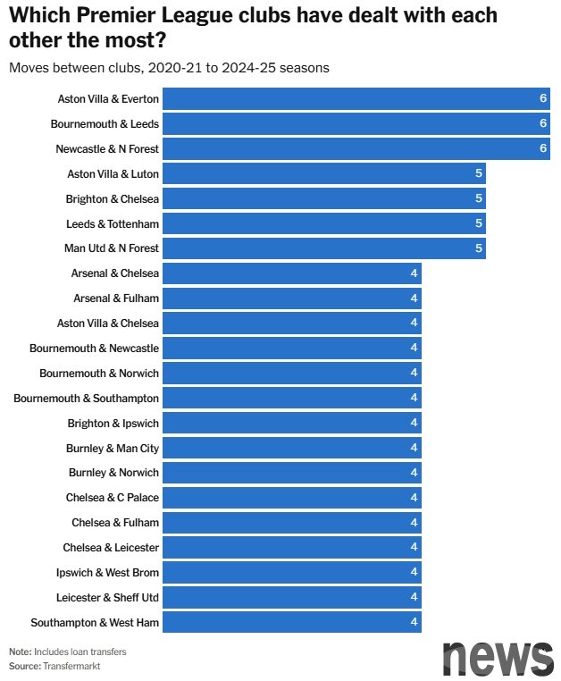 The Athletic counts the internal trading situation of the Premier League from the 2020-21 season to the 2024-25 season. Brighton and Chelsea completed 5 transactions, and Arsenal and Chelsea completed 4 transactions.