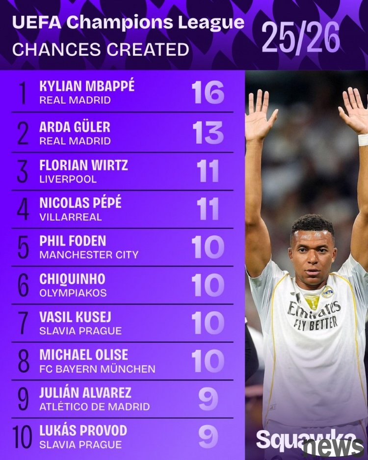 Squawka has compiled a ranking of opportunities created in the Champions League this season so far. Mbappe ranks first, teammate Juler second, and Wirtz third.