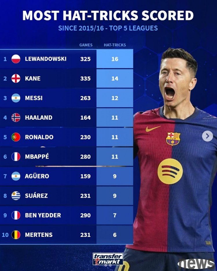Germany's turntable list of hat-tricks in the five major leagues since the 15/16 season, with Lewandon ranked first 16 times, as follows: