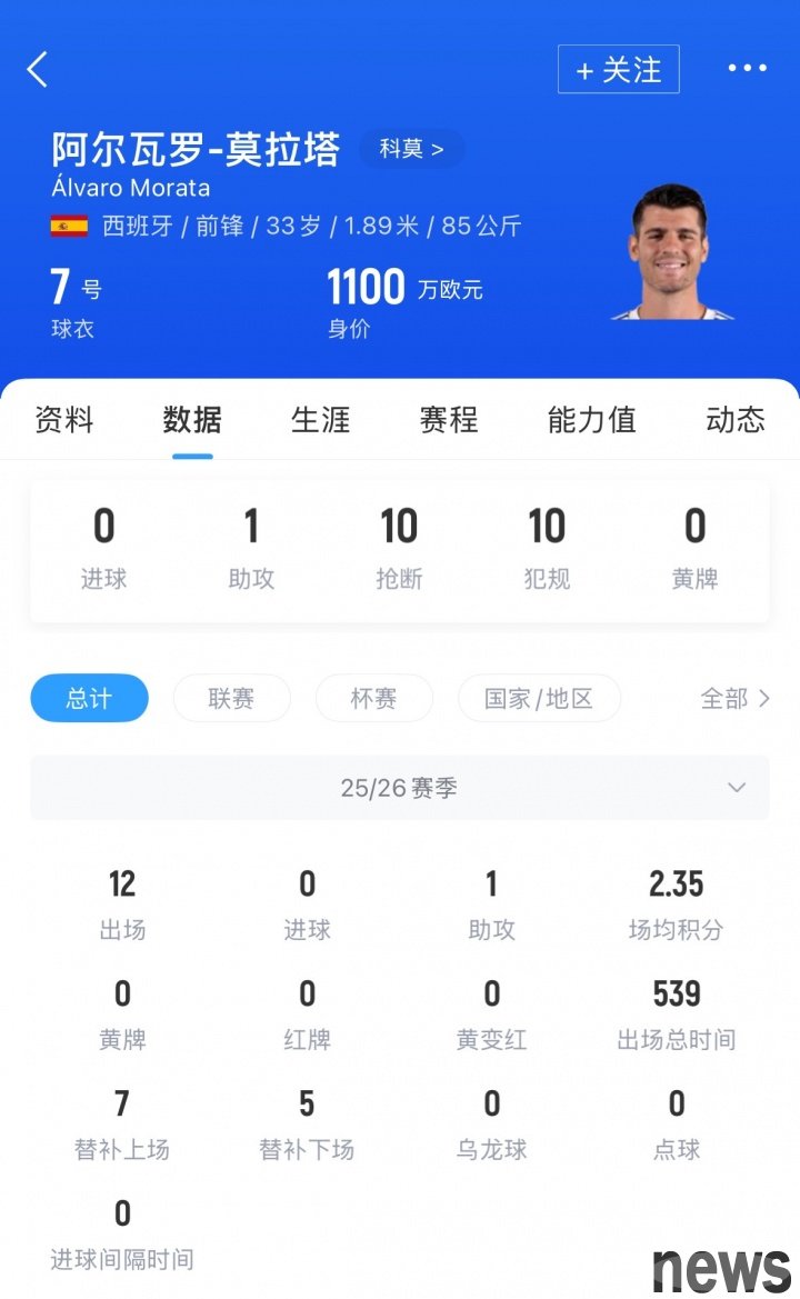 Morata has previously played for many European giants. He came from Real Madrid's youth training and performed well at Juventus. In 2017, Chelsea spent 66 million euros to sign Morata, but his performance never met expectations. The player has since moved to Atletico Madrid, Juventus and other teams, and now Moratad's transfer price is only 11 million euros.