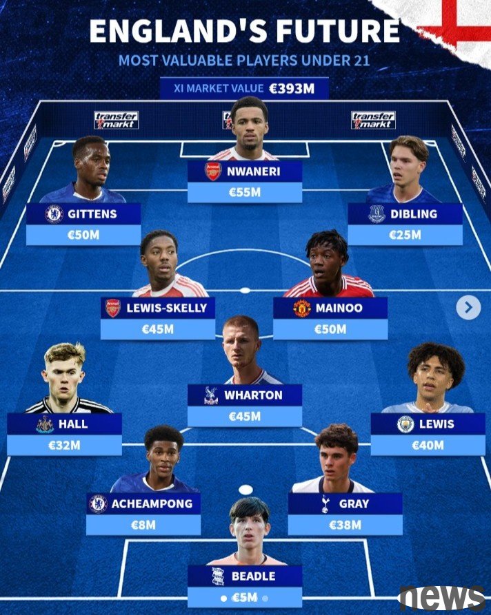 Dezhuan listed the most expensive lineup of England U21. Nwaneri stepped forward, Skelly, Menu, and Gittens were included. The total value of the team was 393 million euros.