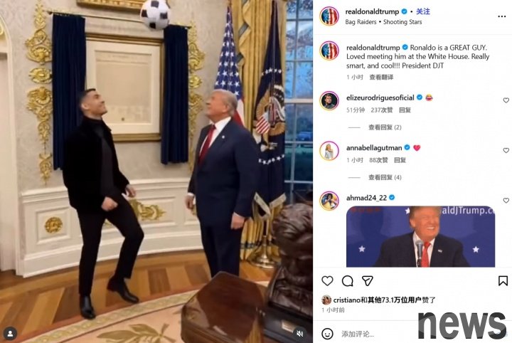U.S. President Trump released an AI-generated video of playing football with Cristiano Ronaldo on social media, with the text: "Cristiano Ronaldo is a great guy. It was a pleasure to meet him at the White House. He is smart and cool!!! - President Donald Trump"